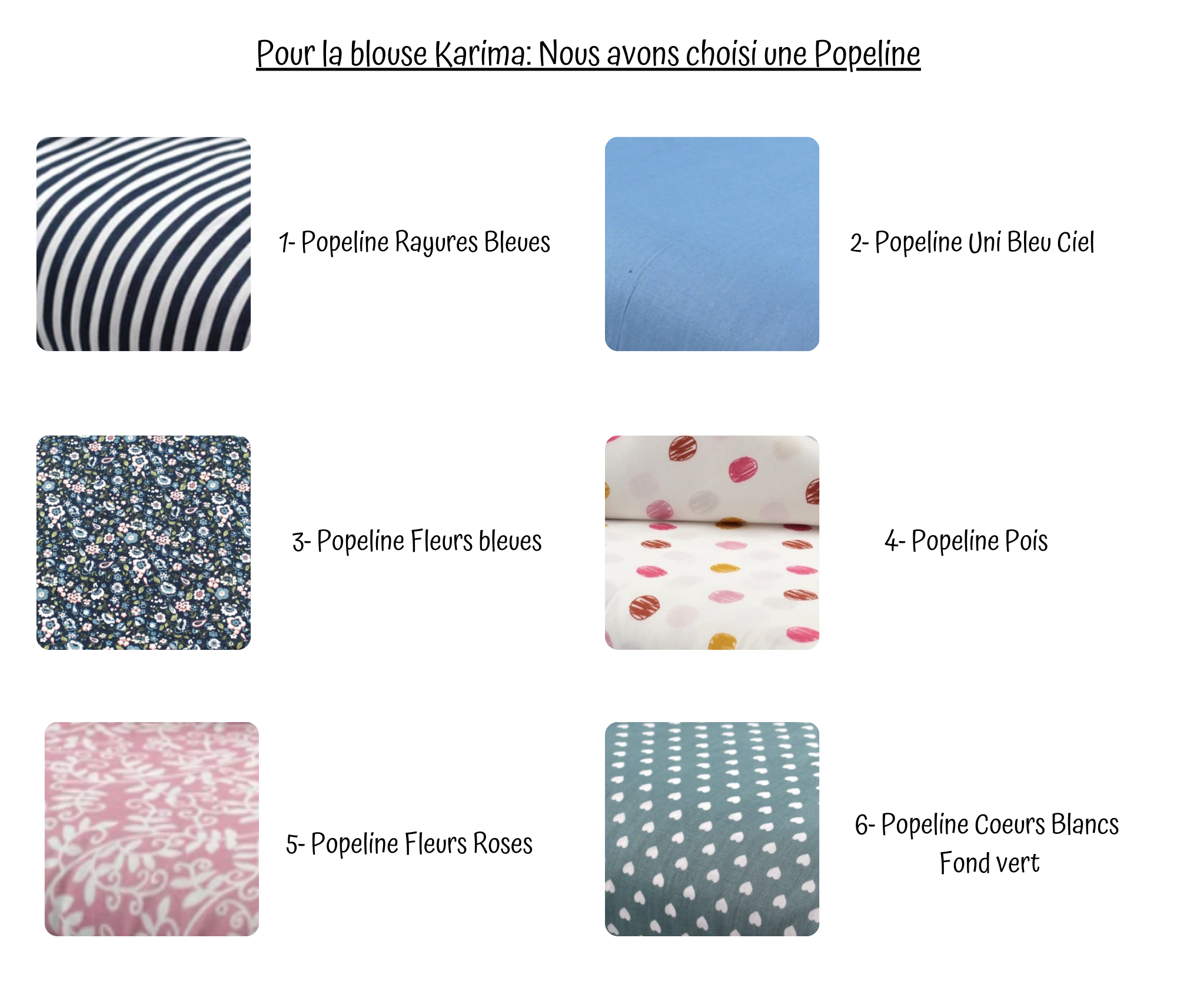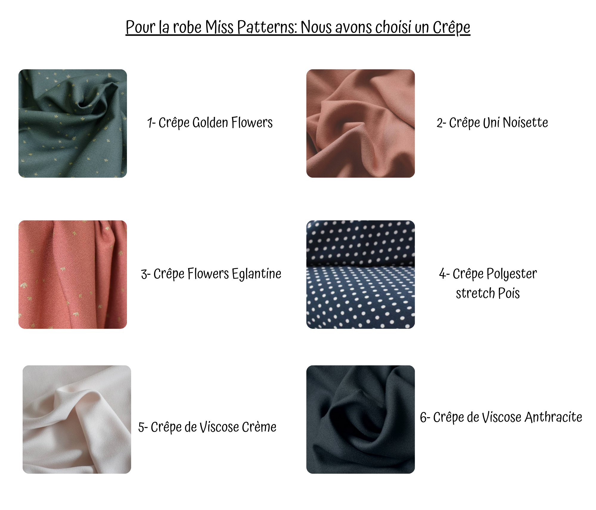 - les tissus et accessoires nécessaires pour réaliser ces 2 beaux patrons, tissus que vous devez choisir parmi les différents choix ci-dessous de nos partenaires COUSETTE et DRIESSENSTOFFEN.
